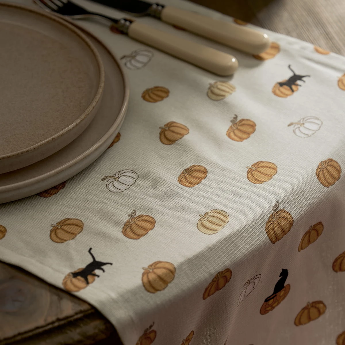 Bring the nostalgic excitement of this time of year to your Halloween table setting or autumnal dinner party, with this stunning Trick or Treat Table Runner. Featuring Sophie’s hand drawn illustrations of golden orange pumpkins and sleek black cats on a neutral ground, this table runner has instant impact in any interior. Sophie’s Trick or Treat design is perfect for giving your kitchen and dining space a seasonal feel, whether preparing a hearty homemade pumpkin soup or hosting a dinner party with friends and family.