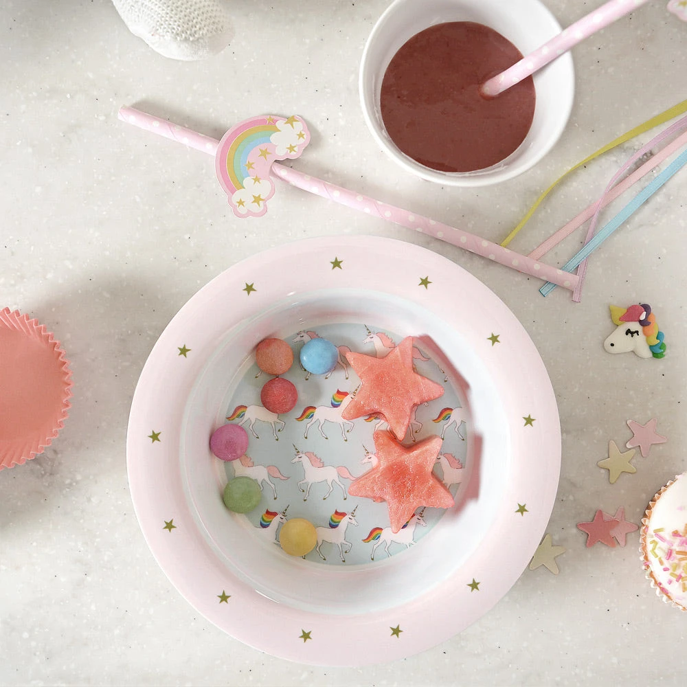 Dotted with candyfloss pink and rainbow unicorns, this seven-piece children’s melamine dining set contains a plate, bowl, cup, knife, fork, spoon, and egg cup. Ideal for birthdays, christenings and Christmas, it’ll certainly brighten up meal times!