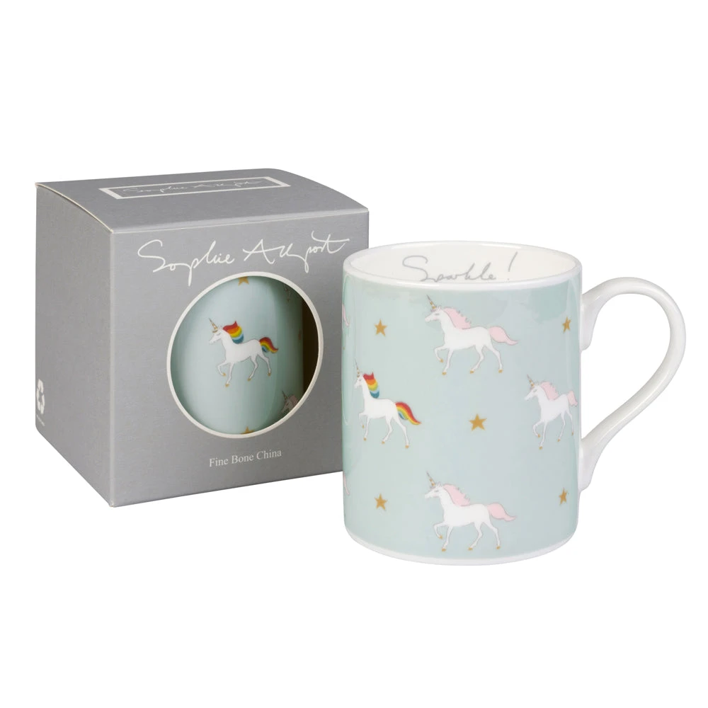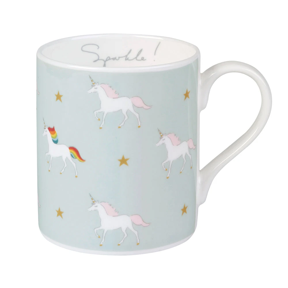 Trotting around against a chalky blue coloured background, graceful unicorns are surrounded by golden stars on this delightful fine bone china mug. Luscious manes and tails are a decadent candyfloss pink, with the occasional magical rainbow unicorn to be spotted. The perfect gift for a bubbly and flamboyant friend.