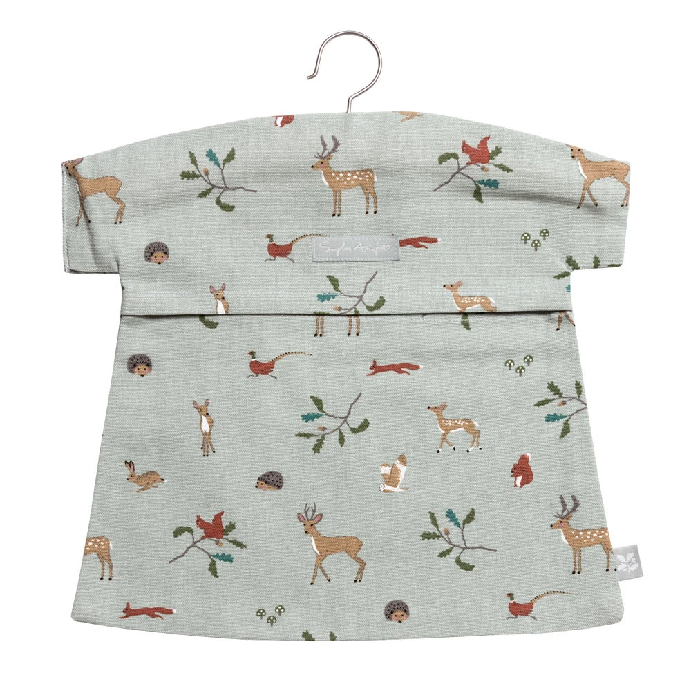 Made from our Woodland fabric, this practical cotton peg bag has an integrated wooden hanger – perfect for hanging on your washing line as you peg out your laundry. The design features red squirrels, deer, pheasants, hedgehogs and the occasional owl on a muted teal coloured background.