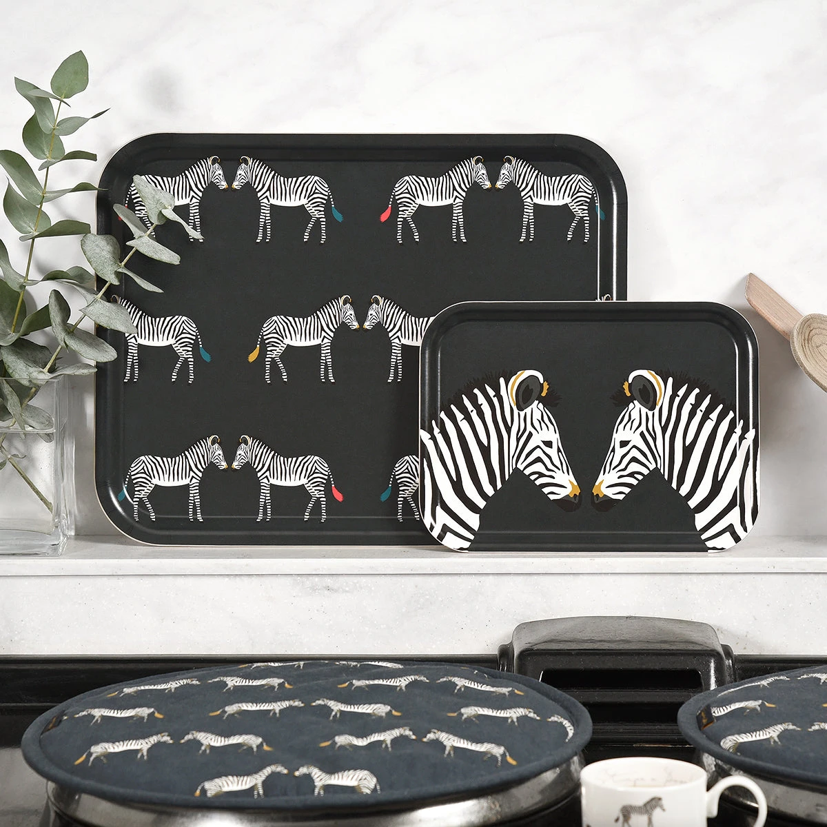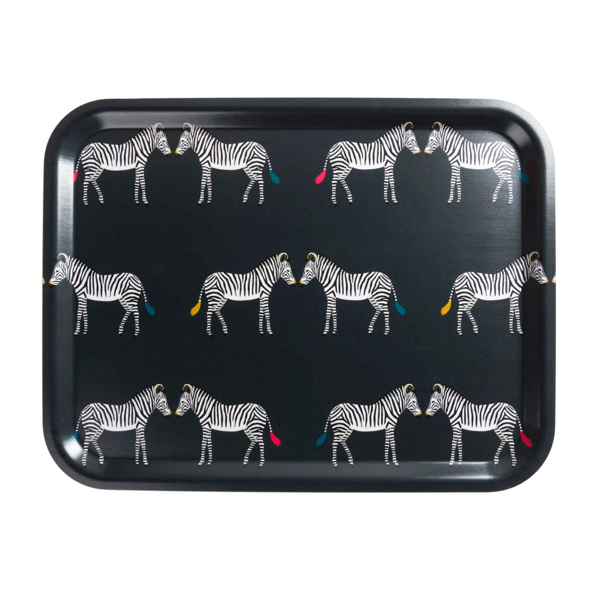 This stylish handmade large printed tray features endangered Grévy’s zebras in a repeated pattern with hints of mustard yellow, pink and blue on a navy charcoal background. This printed tray is made with Birchwood sourced from an FSC certified supplier and is perfect for serving food and drinks or using for décor.