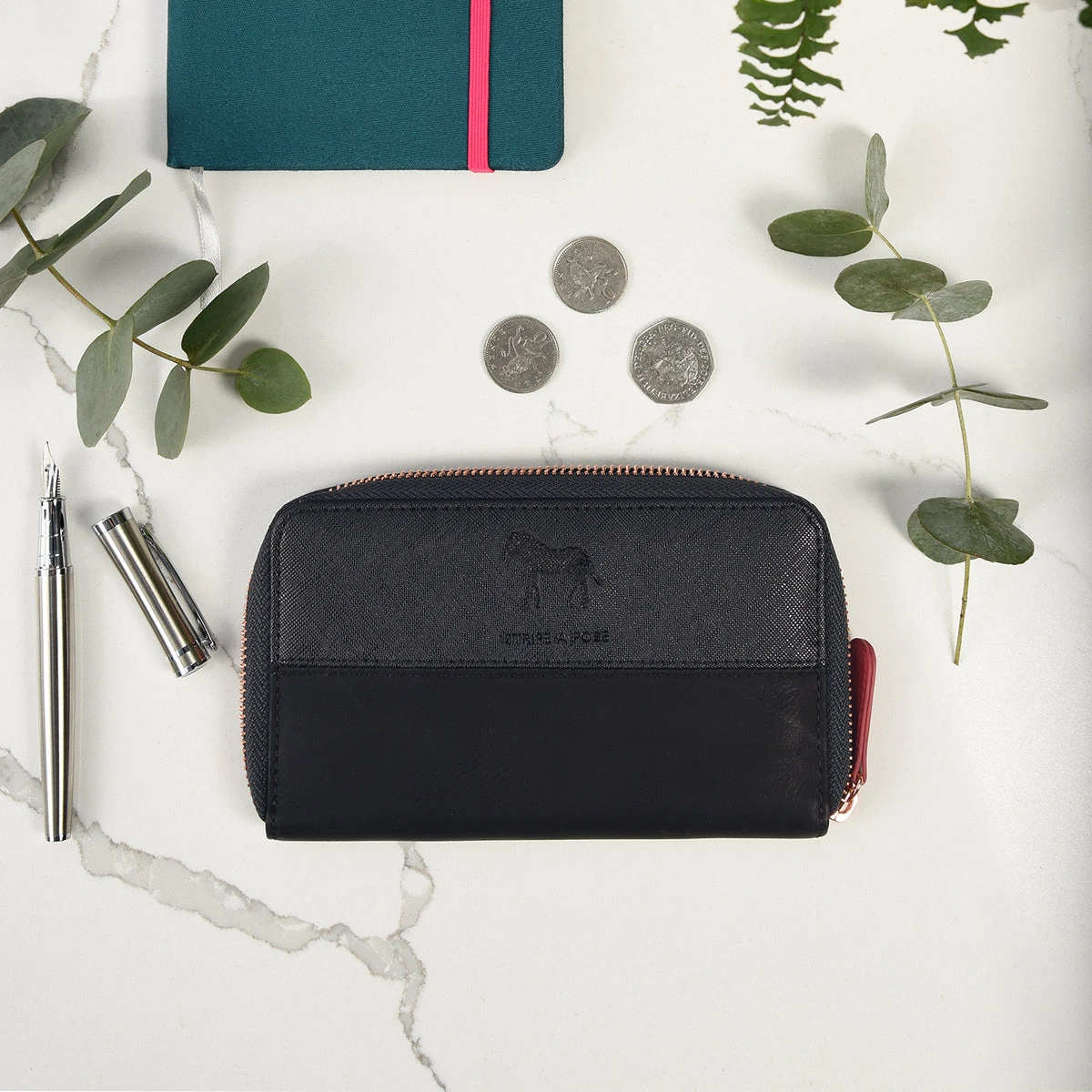 Make a statement with this stylish navy faux suede and faux leather purse which features a contrasting pink zip. There is a debossed zebra on the front with the words ‘stripe a pose’ underneath. A lovely gift accessory or perfect for everyday use.